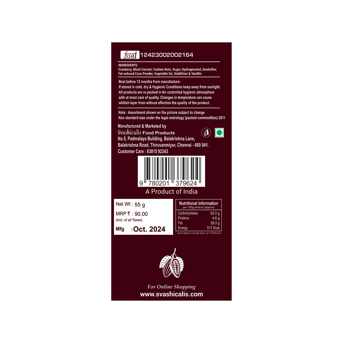 Ingredients: Cranberry, Black Currant, Cashew Nuts, Sugar, Hydrogenated, Emulsifier, Fat reduced Cocoa Powder, Vegetable fat, Stabilizer & Vanillin