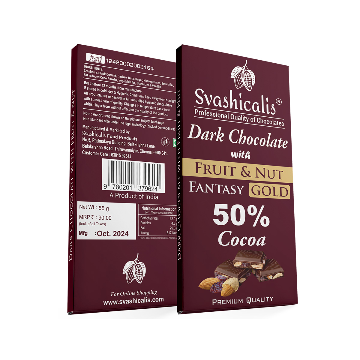 Crafted from the finest cocoa beans and premium ingredients, Svashicalis Dark Chocolate with Fruit and Nut Gold is not only delicious but also a natural source of antioxidants, making it a treat you can feel good about enjoying. Whether you’re looking for a luxurious snack, a thoughtful gift, or a sophisticated addition to your dessert table, this fruit and nut combination is the perfect choice.