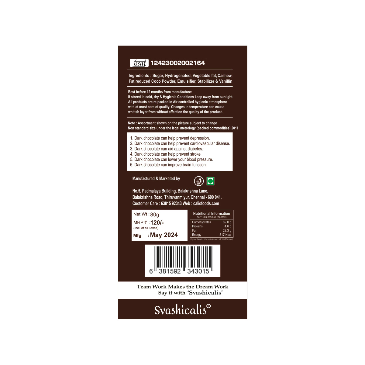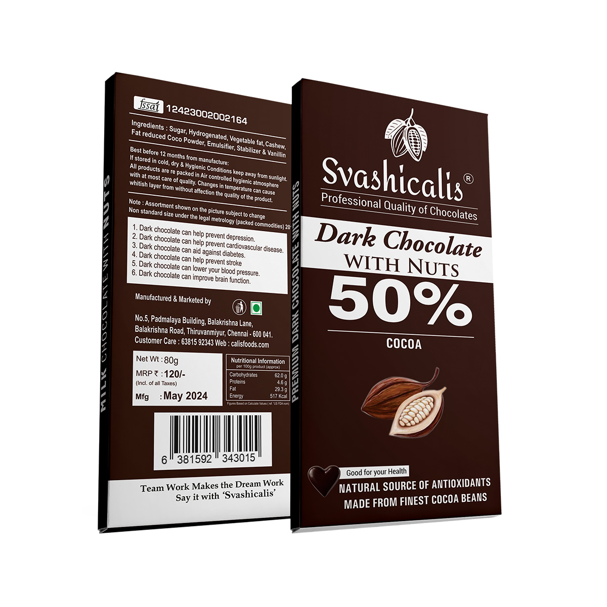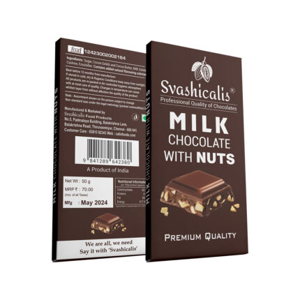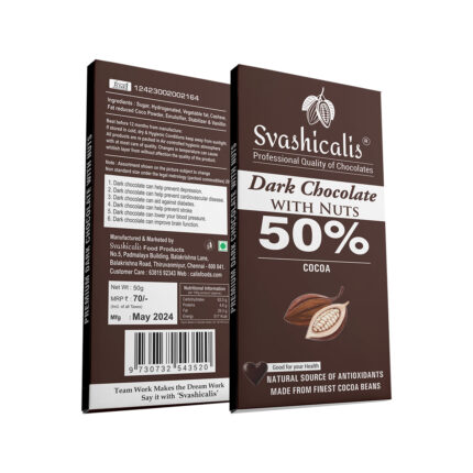 Experience the perfect harmony of rich, dark chocolate and crunchy nuts with Svashicalis Dark Chocolate with Nuts. Made with 50% cocoa, this delectable treat combines the intense flavor of premium dark chocolate with the satisfying crunch of roasted nuts, creating a truly indulgent experience.